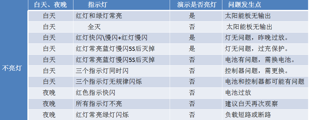 (1)如果出現不亮燈紅色指示燈快閃的數量非常多,陰雨天過多,已經超過燈具最大可承受的陰雨天數。