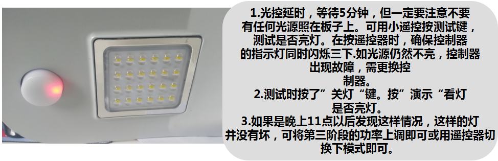 (2)待趕到現場后,先用小遙控按測試鍵是否亮燈?(請確保小遙控在有效距離三米內,并且指示燈同時閃爍三下)若果燈不亮,可判定燈工作出現異常。需要進一步進行排查。如果燈是亮的,并且指示燈正常閃爍在充電,外界的因素比較大,比如陰雨天遮擋等。