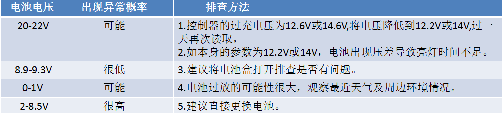 (1)通過前七天的電池HV和LV判斷,其中有一天電池電壓低于9.3V,或HV為20多伏幾乎接近太陽能板空載電壓,通常可判定燈可能出現異常,分以下情況:
