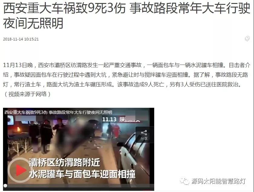 2018年11月13日晚,西安市灞橋區(qū)紡渭路發(fā)生一起嚴重交通事故,一輛面包車與一輛水泥罐車相撞。據(jù)了解,事故路段常年大車行駛夜間無照明。